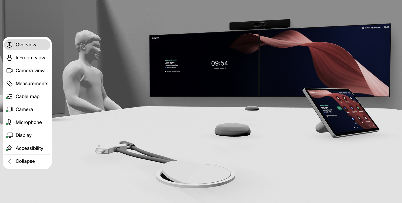 This complements the earlier addition of whiteboarding and hot desking UI scenarios available from the screen content menu of the 3D experience. You can easily visualize the whiteboarding user experience on touch-enabled Cisco devices, including Cisco Desk Series and Board Pro G2 series, while hot desking mode displays the desk availability status on Cisco Desk Series and Desk Phone 9800 Series devices.