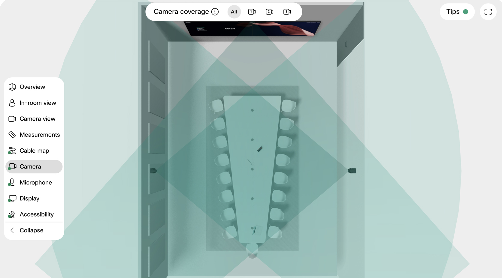 Earlier this year we introduced the new Cisco Room Vision PTZ camera to Workspace Designer to help you configure standard meeting rooms and training spaces with premium presenter tracking, cinematic cross-view and extended speaker view. Since the IP-based tracking camera now uses motorized pan-tilt-zoom in multi-camera deployments, when selected, the tool will automatically model an extended cross-view coverage, capturing more people around the table.