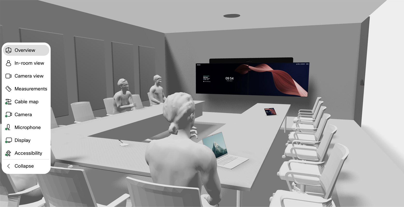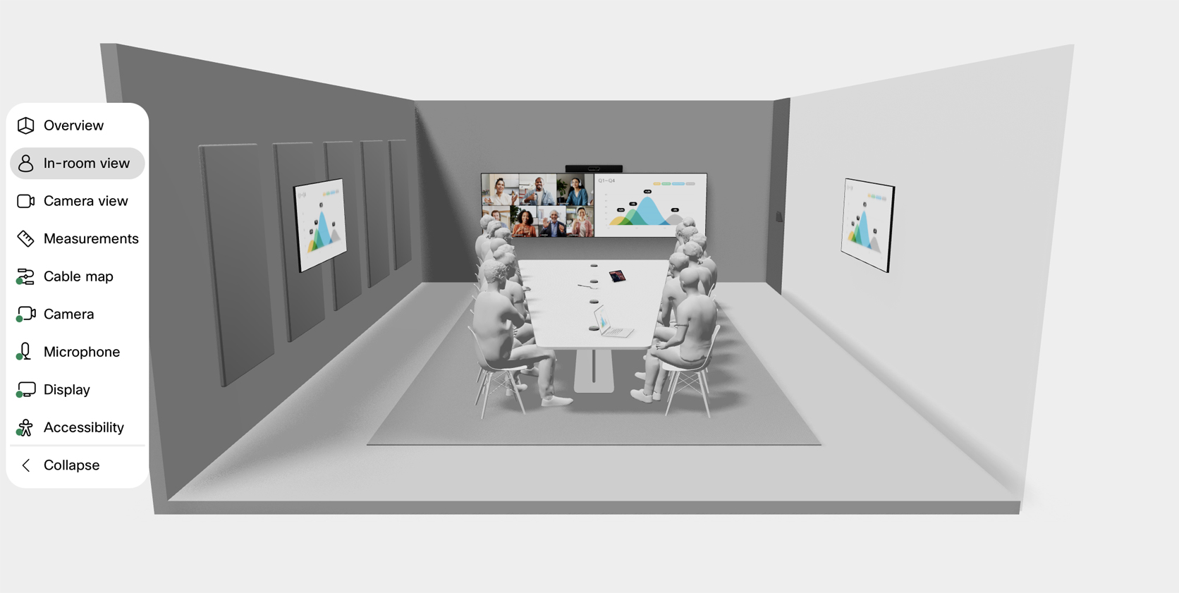 Make sure people at the end of the table in large rooms can also see the shared content clearly by adding extra confidence monitors to the side walls, available in the screen setup step in the sidebar for larger meeting room scenarios.