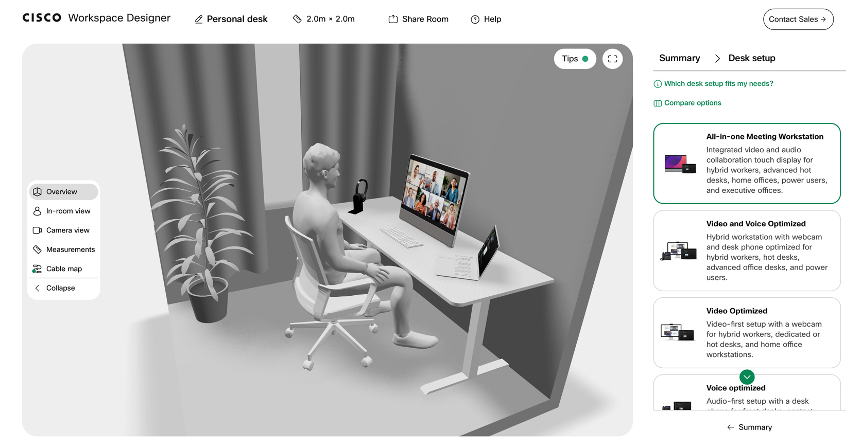 Selecting from the wide range of options can be daunting. That’s why you can choose from preset desk scenarios—ranging from essentials and voice-optimized deployments to hybrid and all-in-one video collaboration—check visual head-to-head product comparisons, and get actionable guidance to find the right desk technology for your use case and user types.