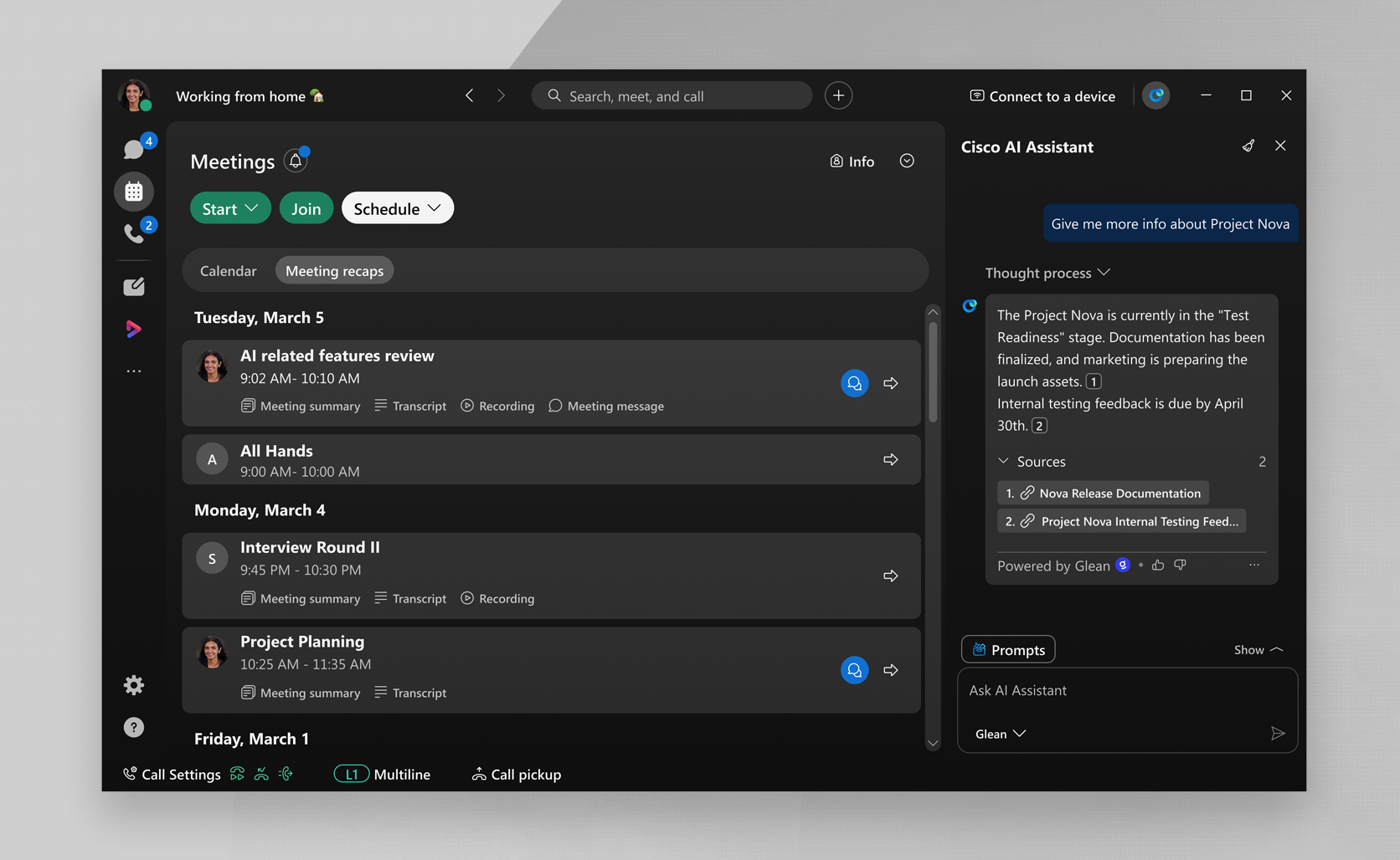 Plus, with expanded search and insight capabilities across popular enterprise apps like Amazon Q, CoPilot, and Glean, Webex makes it simple to find the information you need, wherever you work, empowering all users to stay connected and engaged. When you enable a third-party provider like Glean, AI assistant can seamlessly integrate with it. AI Assistant can search across all your available data sources, to deliver comprehensive answers, ensuring you always have the information you need right when you need it.