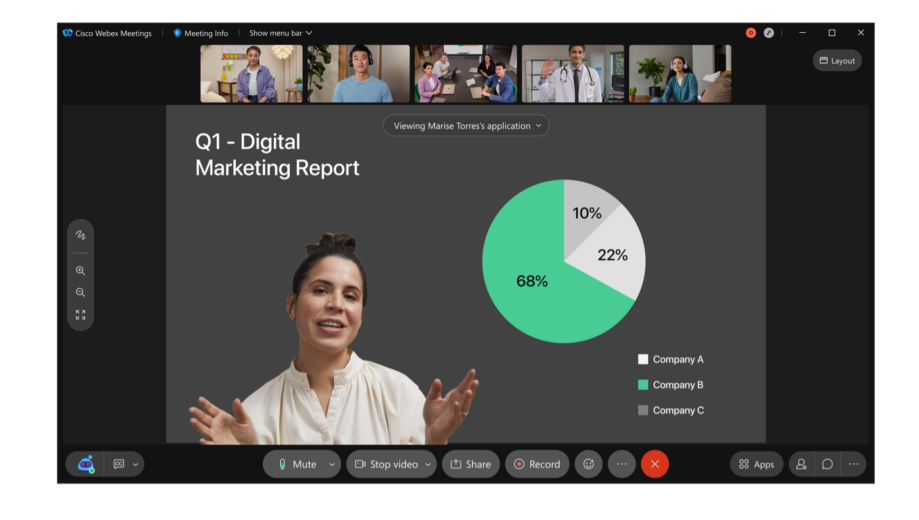 Meetings in real-time are one of the most efficient ways you can work with others and bring everyone together. But having too many of them is leading to meeting fatigue for many people, which is why they need to be even more intentional, purposeful, and engaging. Knowing how critical each minute of a face-to-face interaction can be, we’ve been working hard on making the experience ever more engaging and interactive. This month, we are excited to announce a few features that make not only your meetings, but also your events the best they can be. First, users can now place themselves in front of the content they are sharing in Meetings and Events, providing a more immersive experience for audiences. Second, all paid Webex Meetings users have access to live polling and Q&A by Slido. Third, Slido is now available in Webex Events. Lastly, you can go beyond background noise cancellation and remove distracting human voices from your Meetings with optimize for my voice feature. In addition to immersive share and Slido features, we are also launching several other features this month across Calling, Meetings, and App Experience: