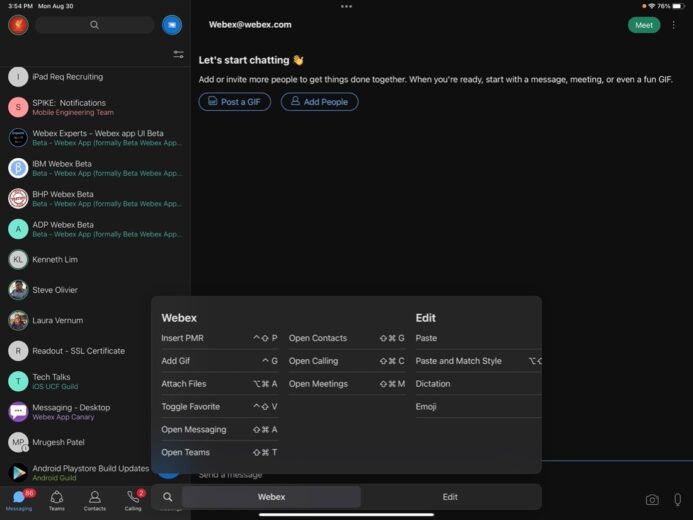 iPad Keyboard shortcuts Now our iPad power users can view Webex keyboard shortcuts by holding the Command ⌘ key on an externally connected iPad keyboard. These shortcuts match the keyboard shortcuts available on Desktop so the transition feels seamless.