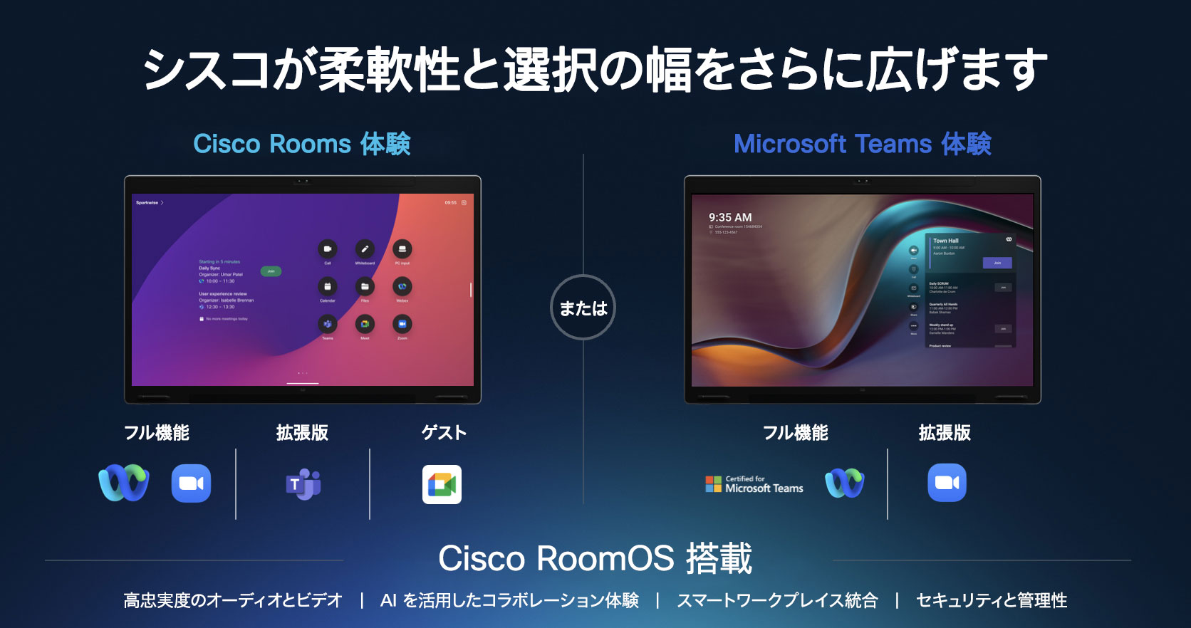 Cisco Rooms としても Microsoft Teams Rooms としても構成できるシスコデバイスは、ユーザーに豊かで信頼性の高いマルチプラットフォーム体験を提供しつつ、IT 部門には求められる品質、セキュリティ、拡張性を確保します。